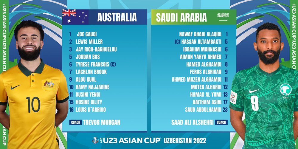 U23 Saudi Arabia: Nawaf, Hammad, Hassan, Khalifah, Moteb, Ayman (Ziyad Al-Johani 75'), Hamed, Awad, Saud Abdulhamid, Haitham (Hussain Al Eisa 9'), Feras.
