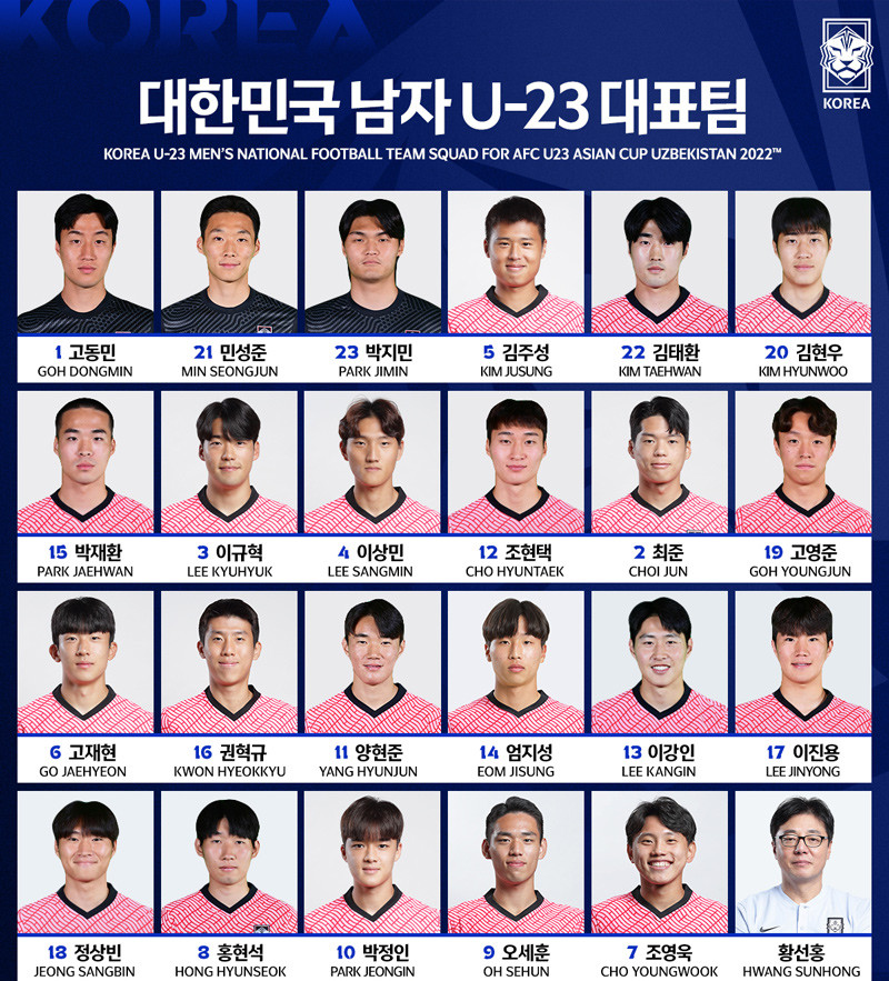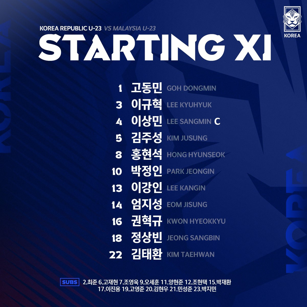 U23 Hàn Quốc: Dongmin, Hyunseok, Jusung, Lee Sangmin, Kyuhyuk, Lee Kangin, Hyeokkyu, Jeongin, Jisung, Sangbin, Taehwan.