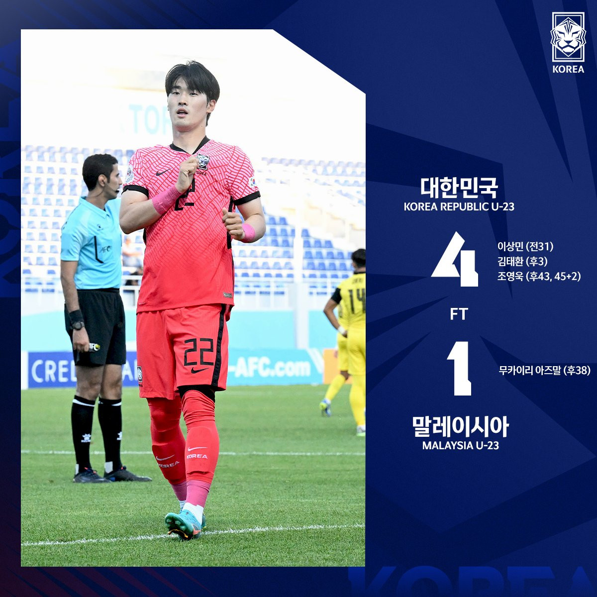 Bàn thắng: Sangmin 31', Taehwan 49', Youngwook 89', 90'+2 - Ajmal 83'