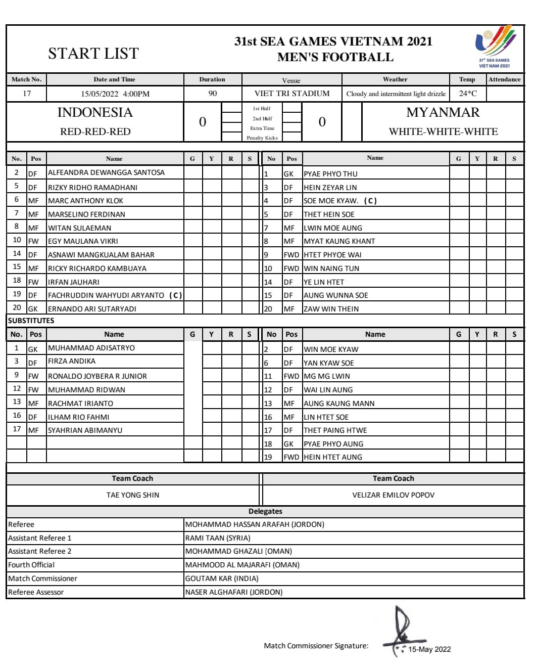 U23 Indonesia: Ernando, Asnawi, Fachruddin, Ridho, Dewangga, Marselino, Klok, Ricky, Witan, Egy, Irfan.