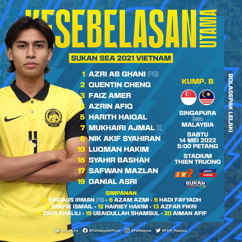 U23 Malaysia: Azri Ghani, Quentin Cheng, Faiz Amer, Azrin Afiq, Harith Haiqal, Mukhairi Ajmal, Nik Akif Syahiran, Luqman Hakim, Syahir Bashah, Safwan Mazlan, Danial Asri.