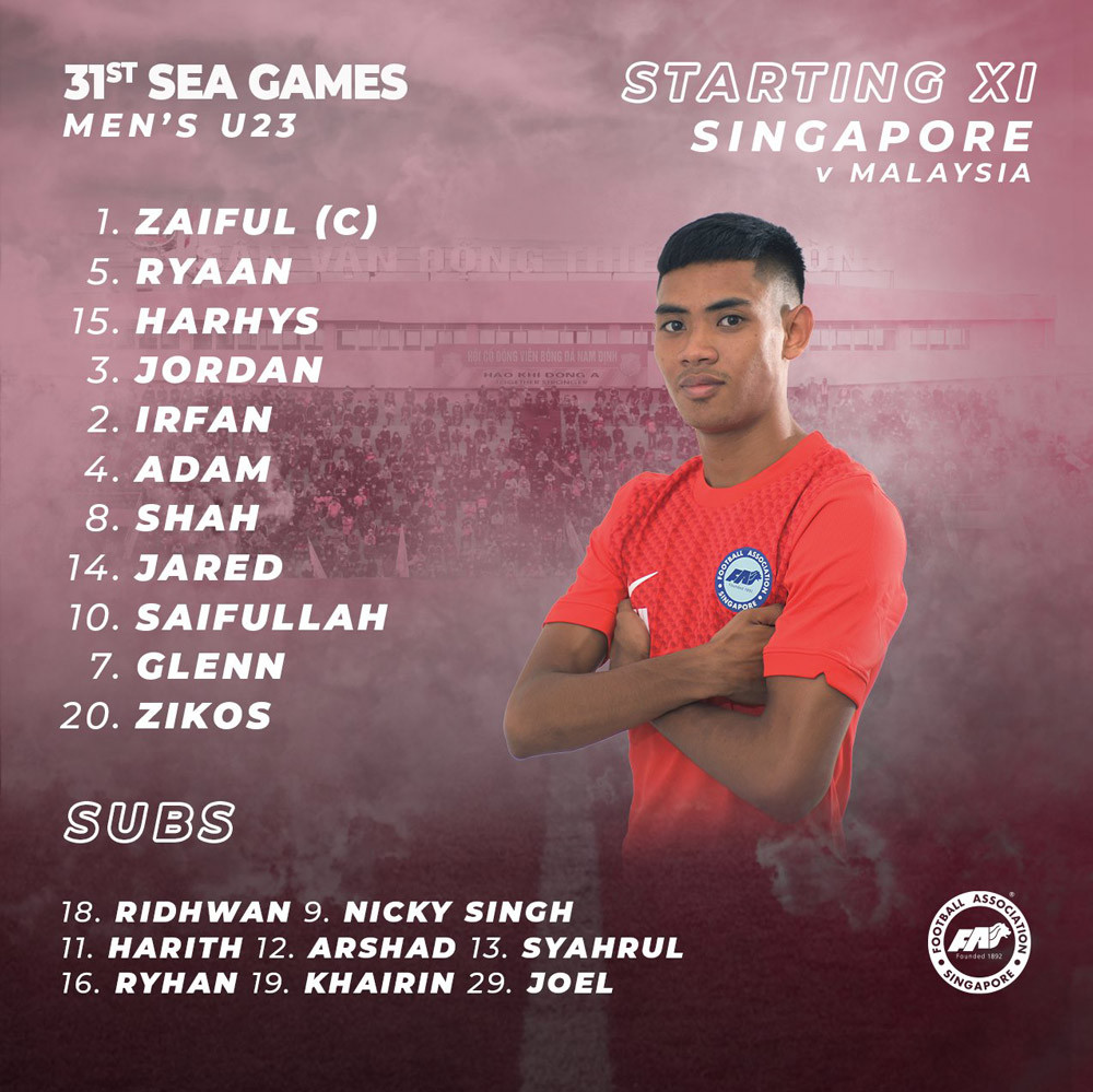 U23 Singapore: Zaiful Nizam; Ryaan Sanizal, Harhys Stewart, Jordan Emaviwe, Irfan Najeeb, Nur Adam Abdullah, Shah Shahiran, Jared Gallagher, Glenn Kweh, Zikos Chua.