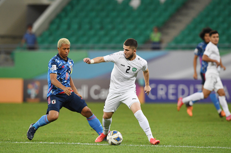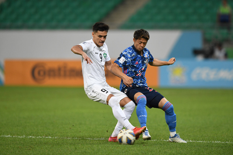 Norchaev có cơ hội dứt điểm căng bằng chân trái chính diện khung thành nhưng hậu vệ U23 Nhật Bản lăn xả cản phá.