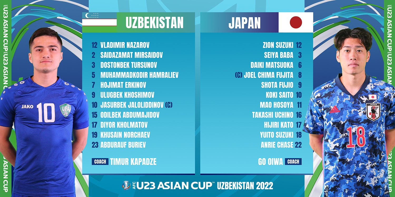 U23 Uzbekistan: Nazarov, Mirsaidov, Tursunov, Hamraliev, Abdumajidov, Khosimov, Kholmatov, Norchaev, Erkinov, Jaloliddinov, Buriev.