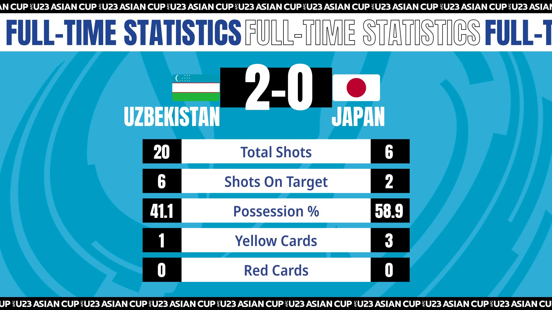 Bàn thắng (2-0, Norchaev): Đón đường chuyền khe thông minh của đồng đội, Norchaev băng xuống dễ dàng hạ thủ thành Suzuki trong pha đối mặt. Bàn thắng là dấu chấm hết cho những hy vọng của các cầu thủ U23 Nhật Bản.