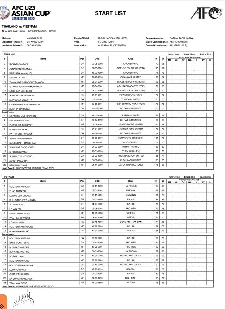 U23 Thái Lan: Kiadthiphon, Suphanat, Achitpol, Ekanit, Thanawat, Chayapiat (Wanchat 28'), Channarong (Benjamin Davies 28'), Chatmongkol, Khemdee, Kaman, Mickelson