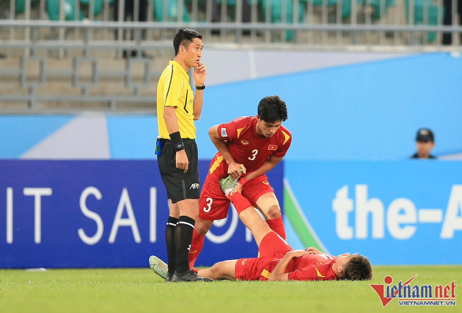 Minh Bình bị đau, anh rời sân bằng cáng ngay sau khi U23 Việt Nam ghi bàn thắng thứ hai.