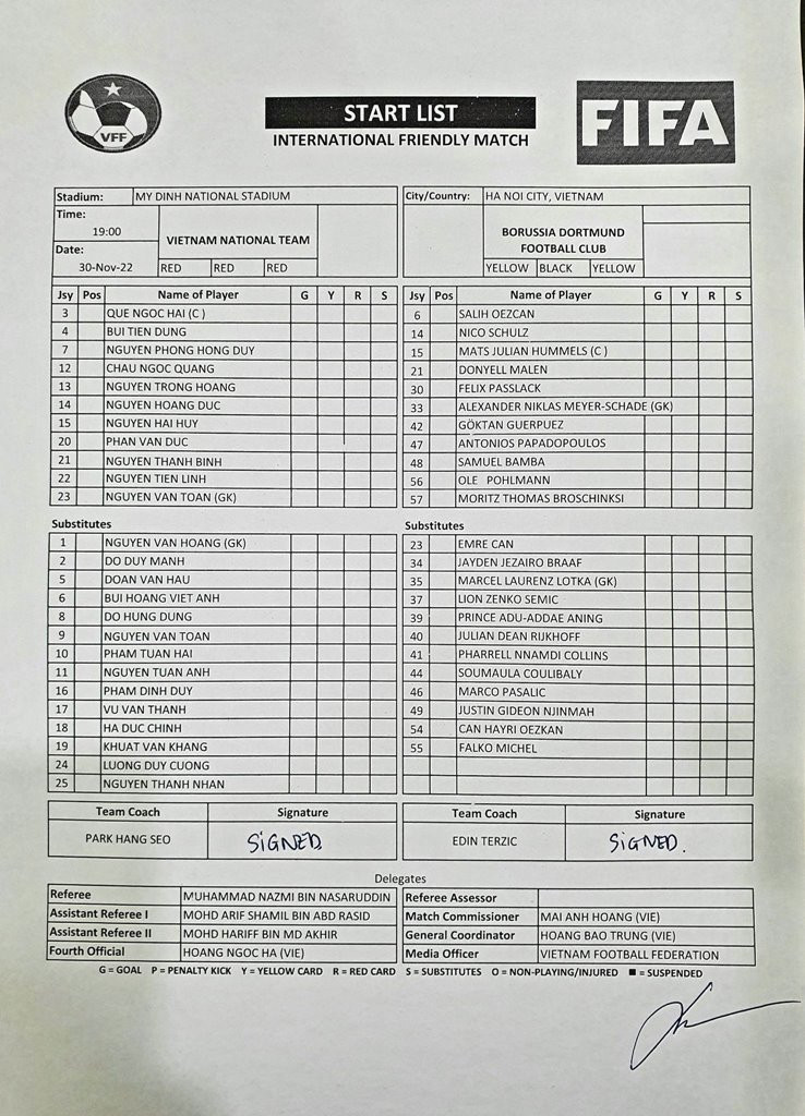 Đội hình chính thức Việt Nam vs Dortmund