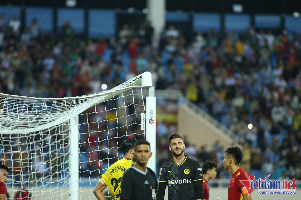 Cột dọc khung thành đã cứu cho tuyển Việt Nam khỏi bàn thua từ cú sút của Ole Pohlmann bên phía Dortmund.