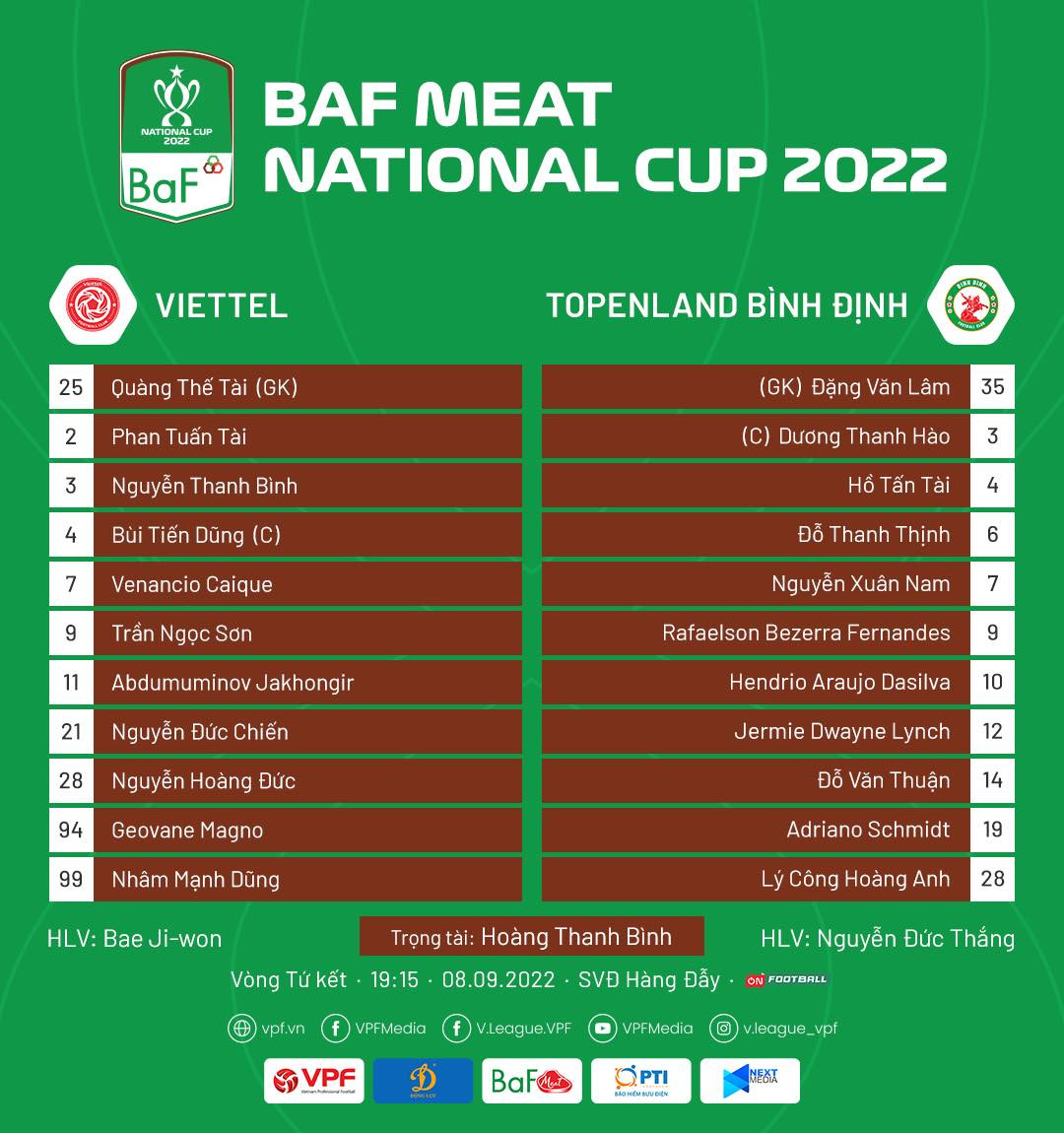 Viettel: Thế Tài, Tuấn Tài (Xuân Kiên, 68’), Thanh Bình, Tiến Dũng, Đức Chiến, Jaha (Khắc Ngọc, 90+5), Ngọc Sơn, Hoàng Đức, Caique (Hoàng Minh, 68’), Mạnh Dũng, Geovane