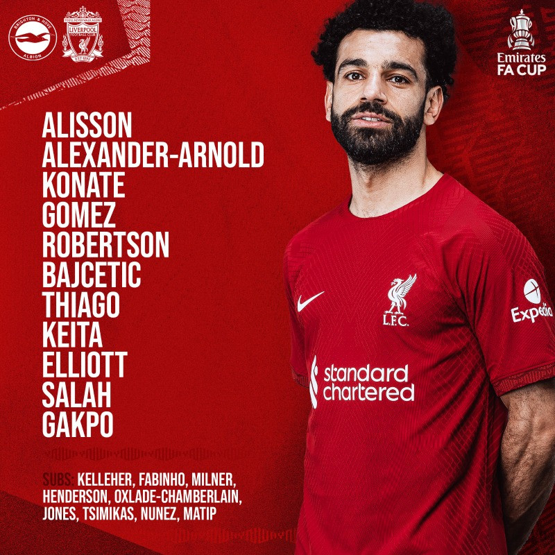Liverpool: Alisson; Alexander-Arnold, Gomez, Konate, Robertson; Thiago, Bajcetic, Keita; Salah, Elliott, Gakpo.