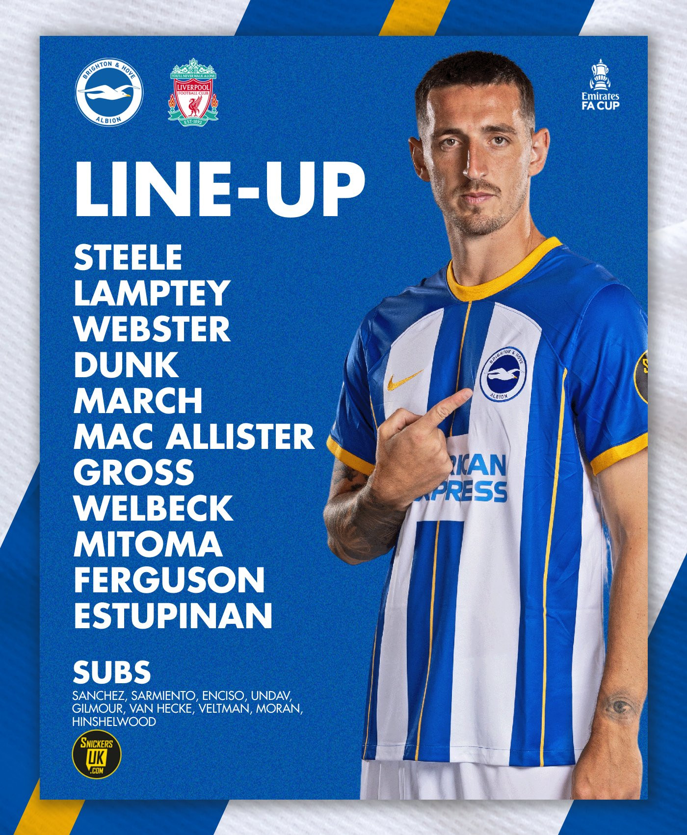 Brighton: Steele; Lamptey, Dunk, Webster, Estupinan; Gross; March, Mac Allister, Mitoma; Ferguson, Welbeck.