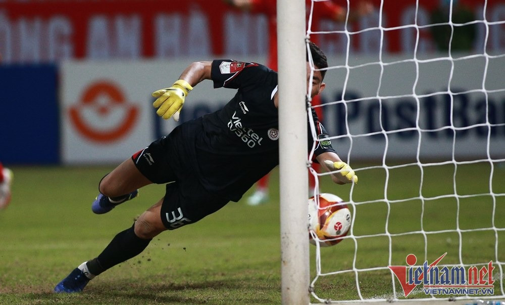 Thủ môn Bùi Tiến Dũng bắt dính trái bóng từ pha đánh đầu của ngoại binh bên phía Viettel FC.