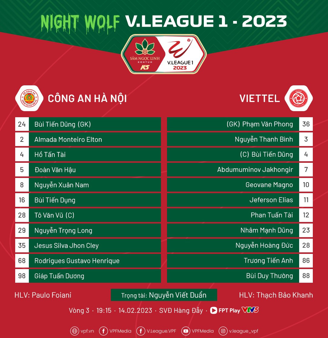 Viettel: Văn Phong, Duy Thường, Thanh Bình, Tiến Dũng, Tuấn Tài, Tiến Anh, Hoàng Đức (Đức Chiến 58'), Jaha, Mạnh Dũng (Danh Trung 67'), Geovane (Hoàng Minh 14' - Hữu Thắng 68'), Jeferson.