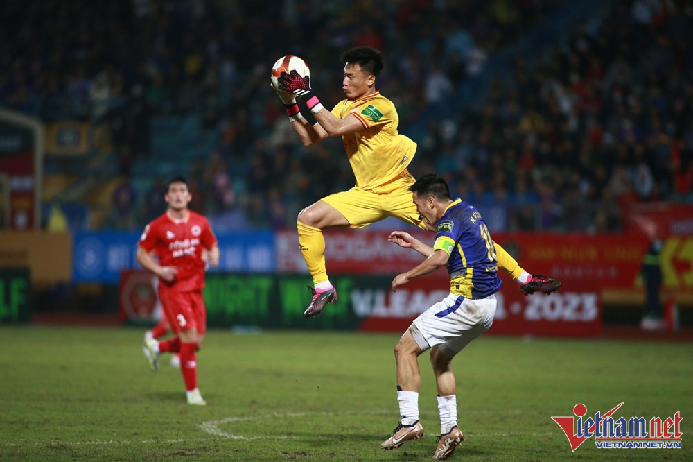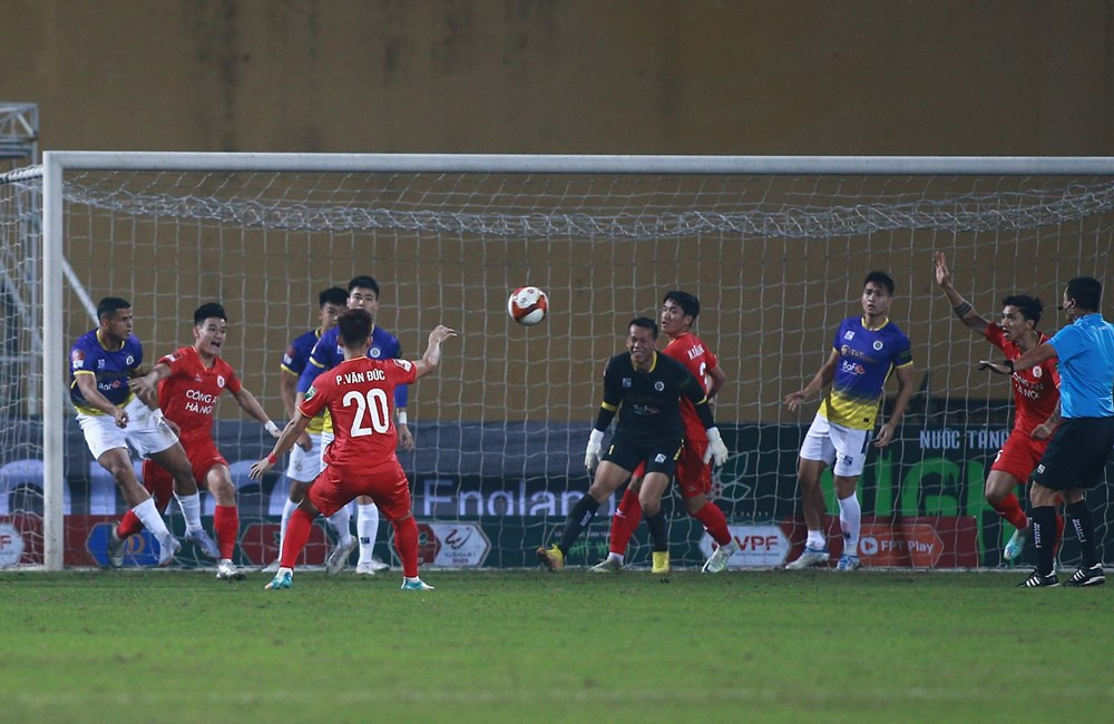 Đến lượt Thành Chung kết thúc sát vòng cấm, bóng khẽ chạm chân cầu thủ CAHN rồi "liếm" mép ngoài cột dọc khung thành thủ môn Bùi Tiến Dũng.