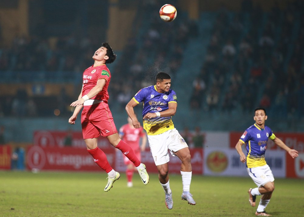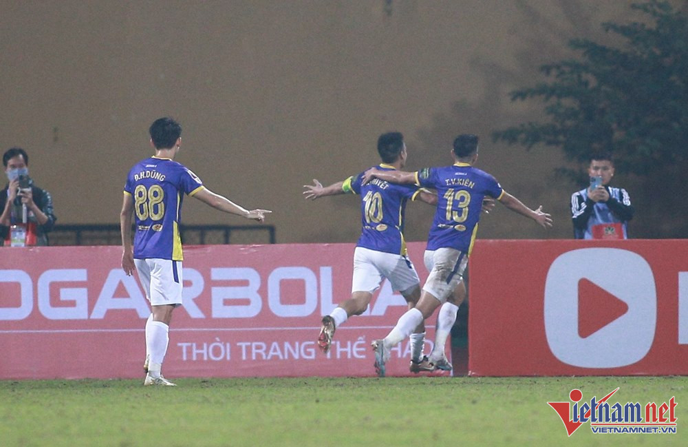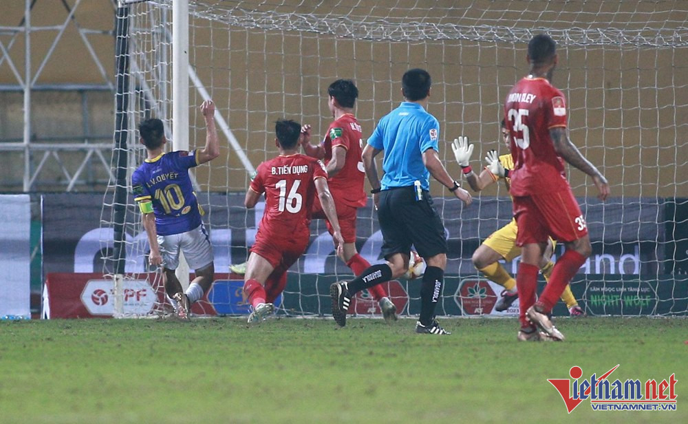Đón đường chuyền bổng của đồng đội từ cánh phải, đội trưởng Văn Quyết chạy chỗ thông minh rồi đánh đầu hạ thủ môn Bùi Tiến Dũng đưa Hà Nội FC vượt lên dẫn trước.