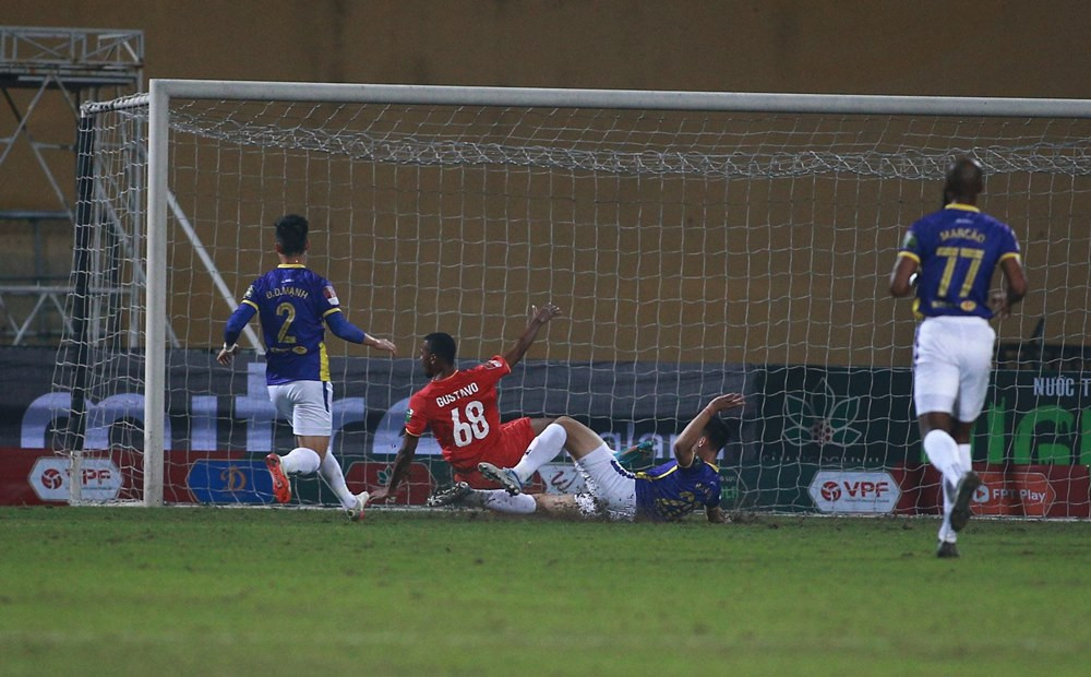 Văn Quyết xâm nhập vòng cấm, anh dứt điểm bị Văn Hậu cản phá, đội trưởng của Hà Nội FC lập tức đá bồi xuyên qua khe giữa hai chân thủ môn Bùi Tiến Dũng nâng tỉ số lên 2-0.