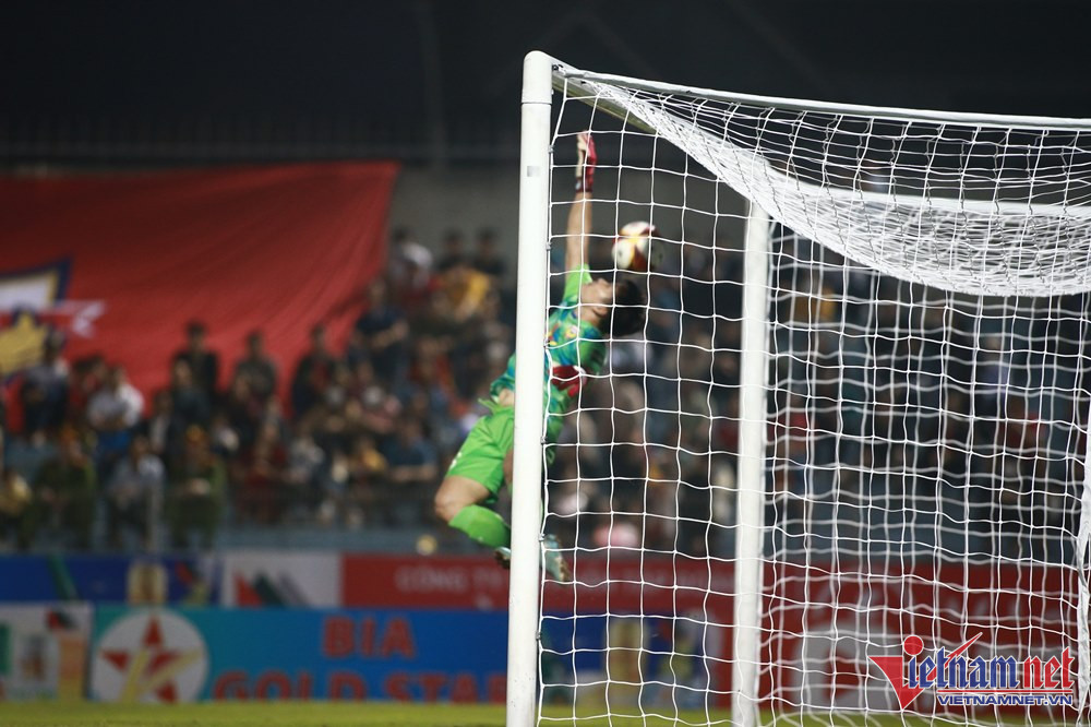 Từ chấm đá phạt ngoài vòng cấm Hà Tĩnh, đội trưởng Văn Quyết kết thúc đưa bóng chạm mép dưới xà ngang rồi đập vào lưng thủ môn Quang Tuấn trước khi bay vào lưới chủ nhà.