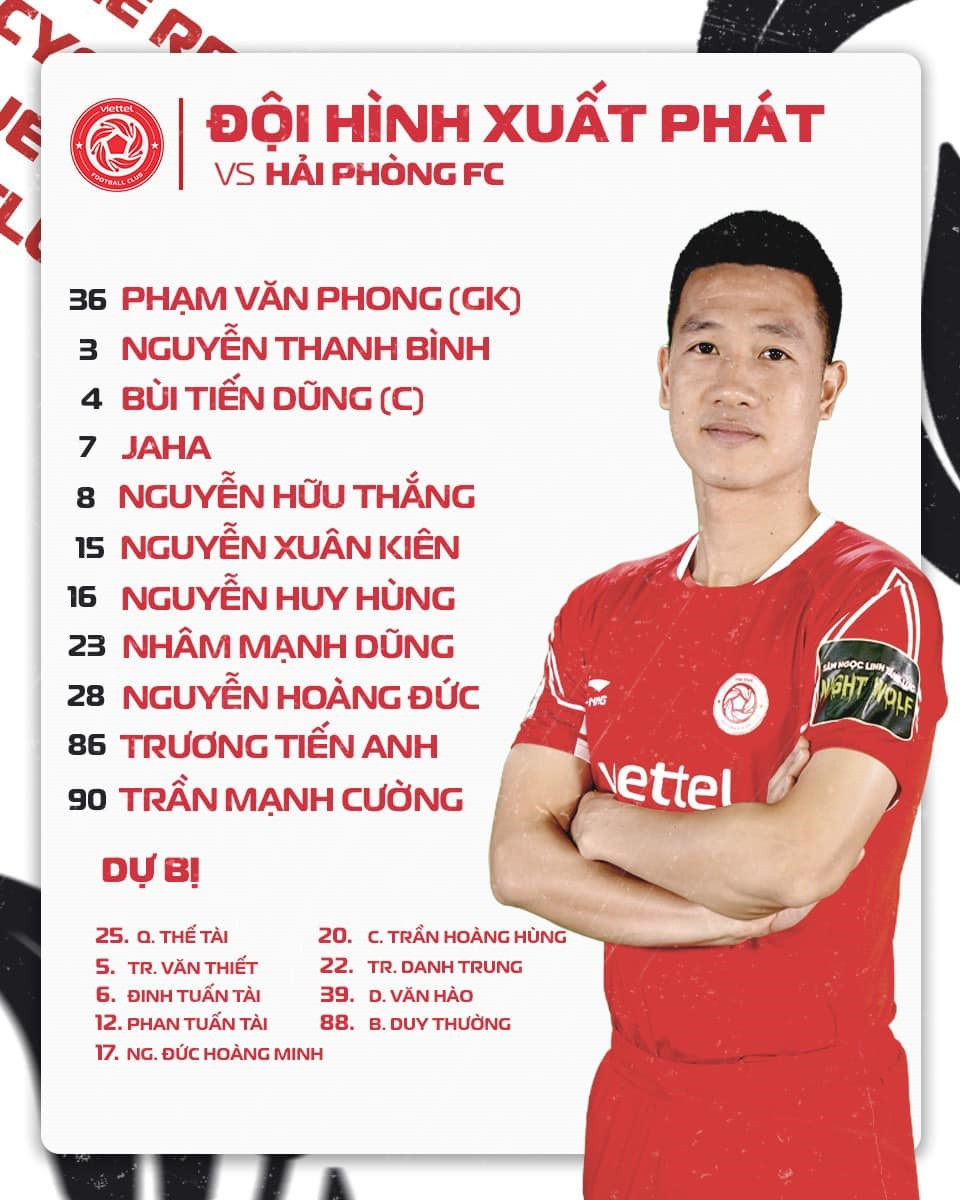 Viettel: Văn Phong (36), Thanh Bình (3), Tiến Dũng (4), Xuân Kiên (Tuấn Tài 24'), Mạnh Cường (Duy Thường 64'), Abdumuminov Jaha (7), Hữu Thắng (Minh Hoàng 46'), Hoàng Đức (28), Huy Hùng (Danh Trung 46'), Tiến Anh (86), Mạnh Dũng (Văn Hào 82')