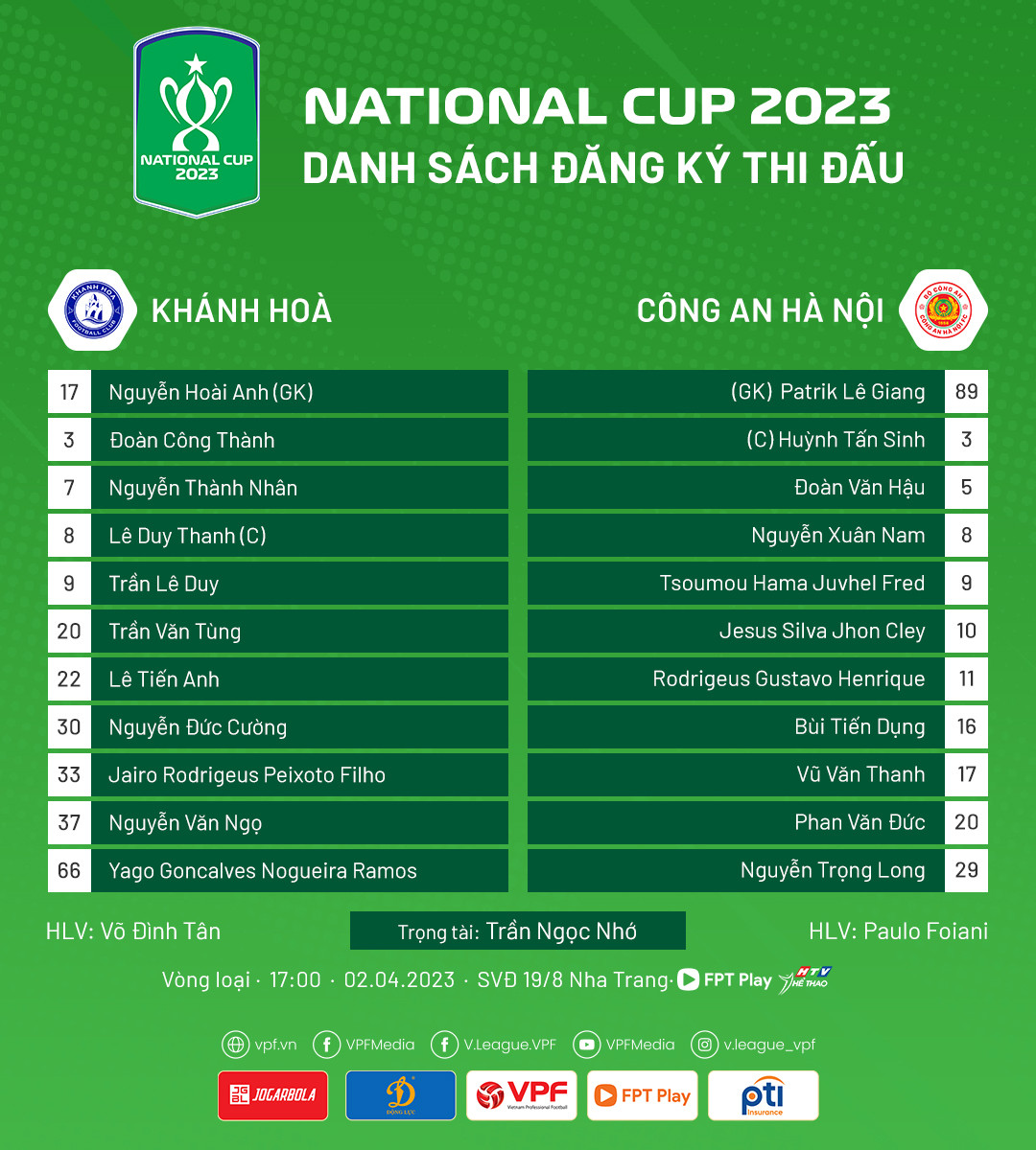Khánh Hoà: Hoài Anh (17), Jairo Filho (33), Công Thành (3), Văn Ngọ (37), Duy Thanh (8), Thành Nhân (7), Tiến Anh (22), Đức Cường (30), Lê Duy (9), Văn Tùng (20), Yago Ramos (66).