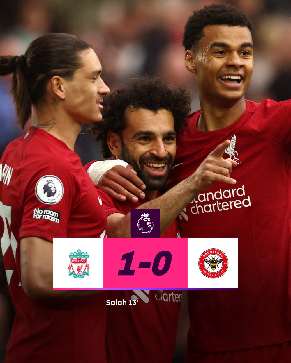 Salah tỉa bóng xuống cho Nunez kết thúc góp hẹp nhưng bị hậu vệ Brentford truy cản.