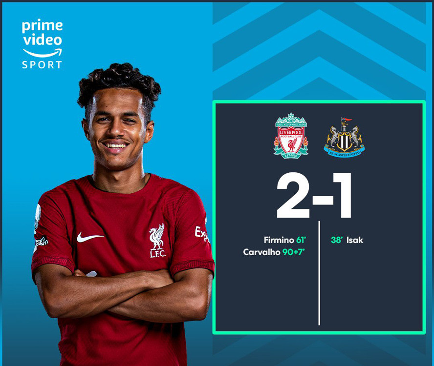 Pha lập công của Fabio Carvalho phút 98 đem về chiến thắng nghẹt thở 2-1 cho Liverpool, trong thế trận bị đội khách Newcastle vượt lên dẫn trước.