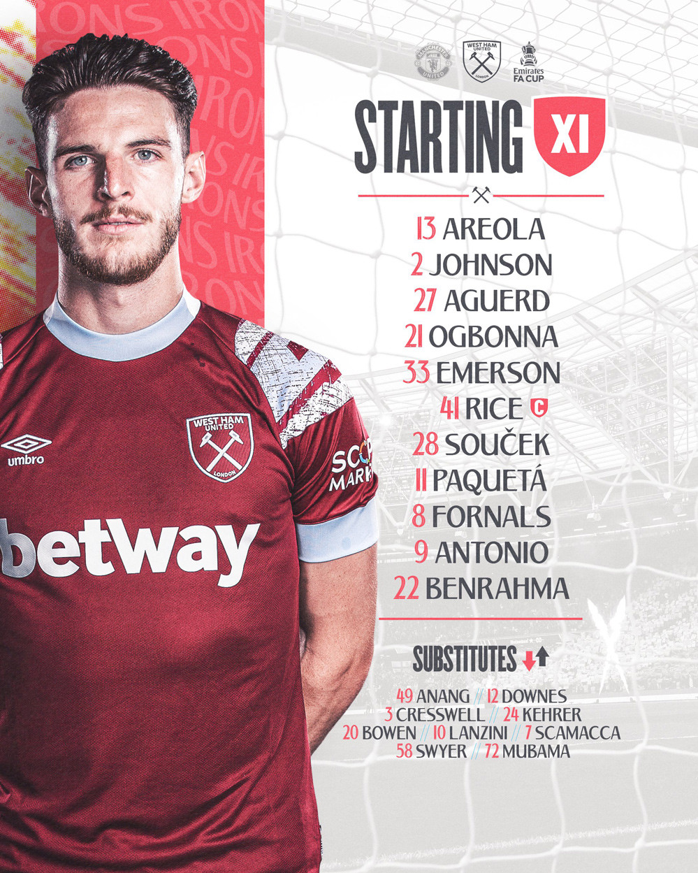 West Ham: Areola, Ogbonna, Emerson, Aguerd, Johnson, Soucek, Rice, Paqueta, Benrahma, Fornals (Bowen 73'), Antonio.