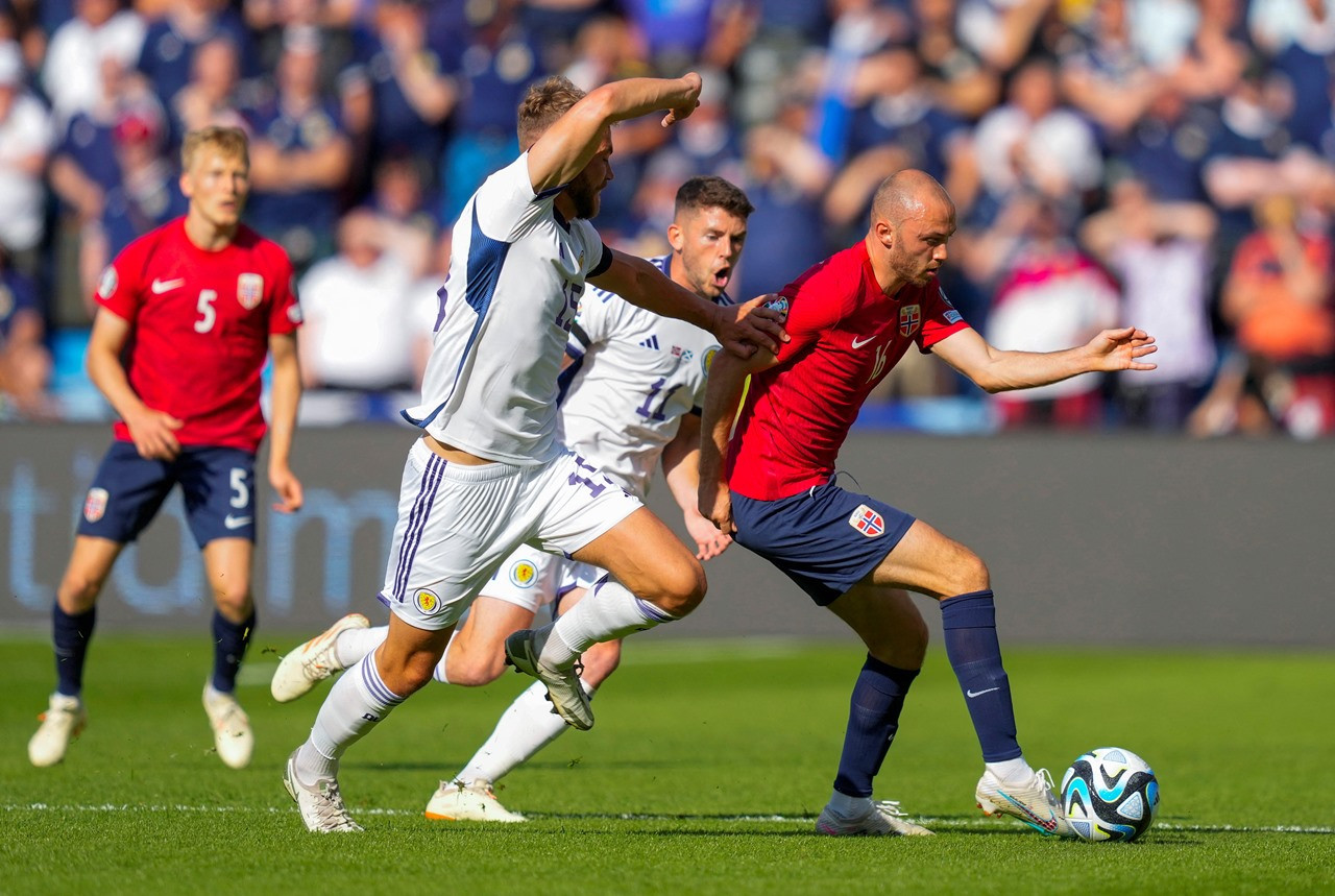 Một tuần sau khi cùng Man City vô địch UEFA Champions League, Haaland đá chính trong màu áo ĐTQG Na UyTrận đấu giữa Na Uy và Scotland diễn ra hấp dẫnHaaland chơi xông xáo như thường thấy, anh nhận được "chăm sóc" đặc biệt của các hậu vệ ScotlandPhút 61, chân sút 22 tuổi bị phạm lỗi trong vòng cấm, đích thân anh thực hiện thành công quả phạt đền để mở tỉ số cho đội chủ nhàPhút 84 Haaland được rút ra nghỉ, Scotland vùng lên mạnh mẽ Đội khách có được liên tiếp 2 bàn thắng chỉ trong ít phút cuối trậnPhút 87, Lyndon Dykes gỡ hòa 1-1Sau đó 2 phút Kenny McLean ghi bàn định đoạt trận đấuScotland tạo nên cuộc lội ngược dòng ngoạn mục trước Na UyNa Uy thua ngược khi không có Haaland trên sânKết quả loạt trận vòng loại EURO 2024 đêm qua, rạng sáng nay