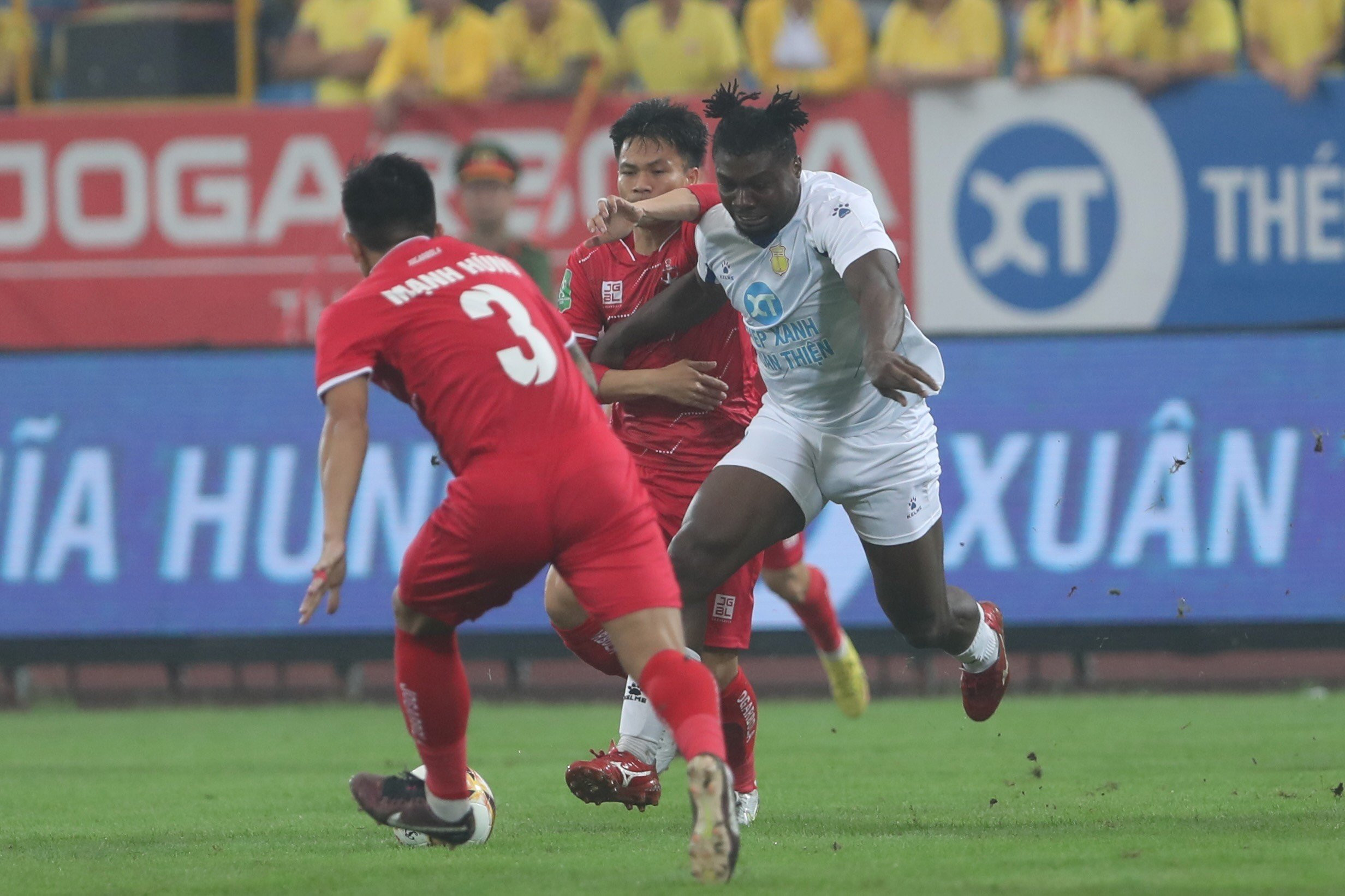 Thủ thành Nguyên Mạnh bỏ khung thành lao ra phá bóng không tốt, may cho Nam Định khi hai người đồng đội kịp lao về bọc lót.