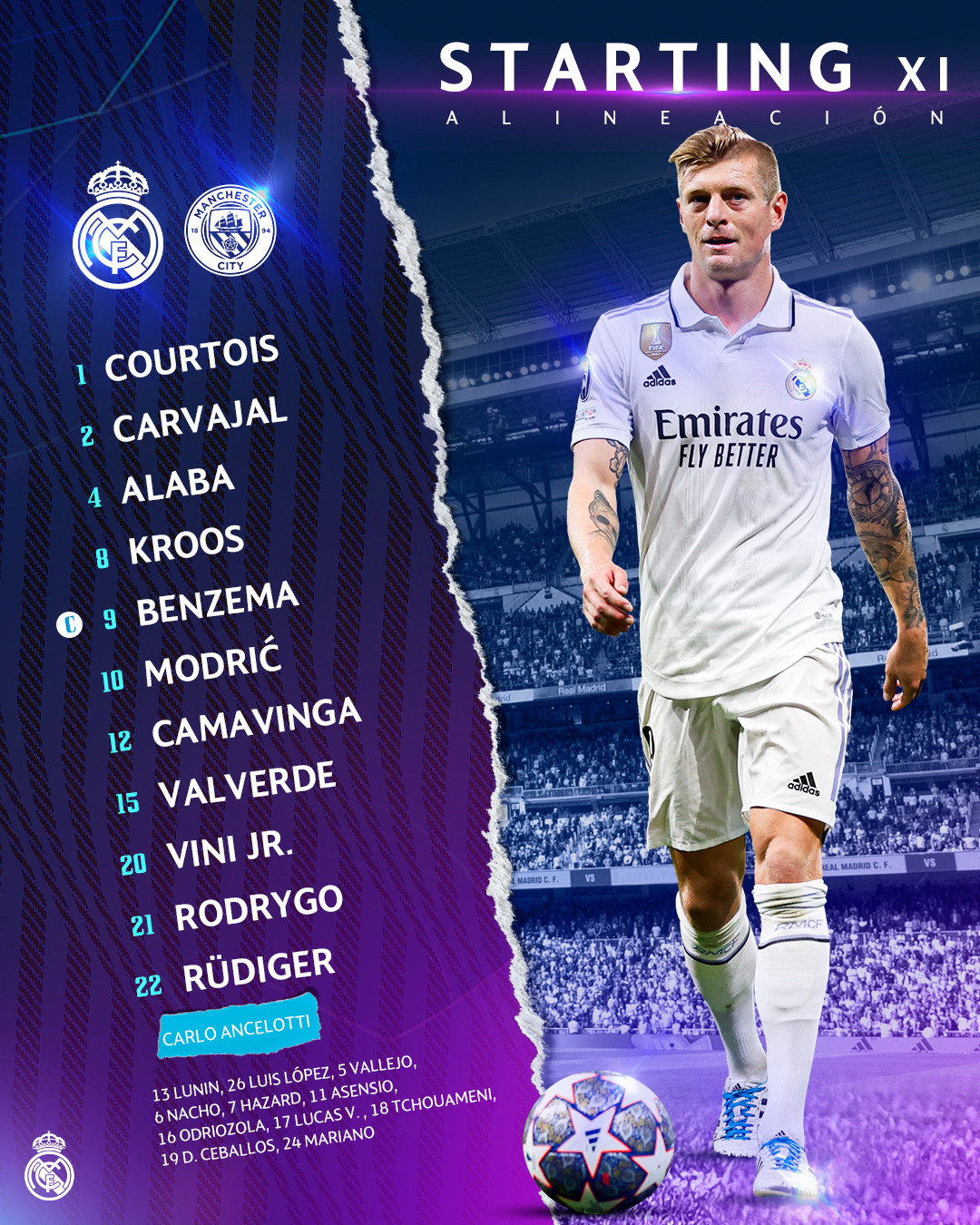 Real Madrid: Courtois; Carvajal, Rudiger, Alaba, Camavinga; Valverde, Kroos, Modric; Rodrygo, Benzema, Vinicius Jr.
