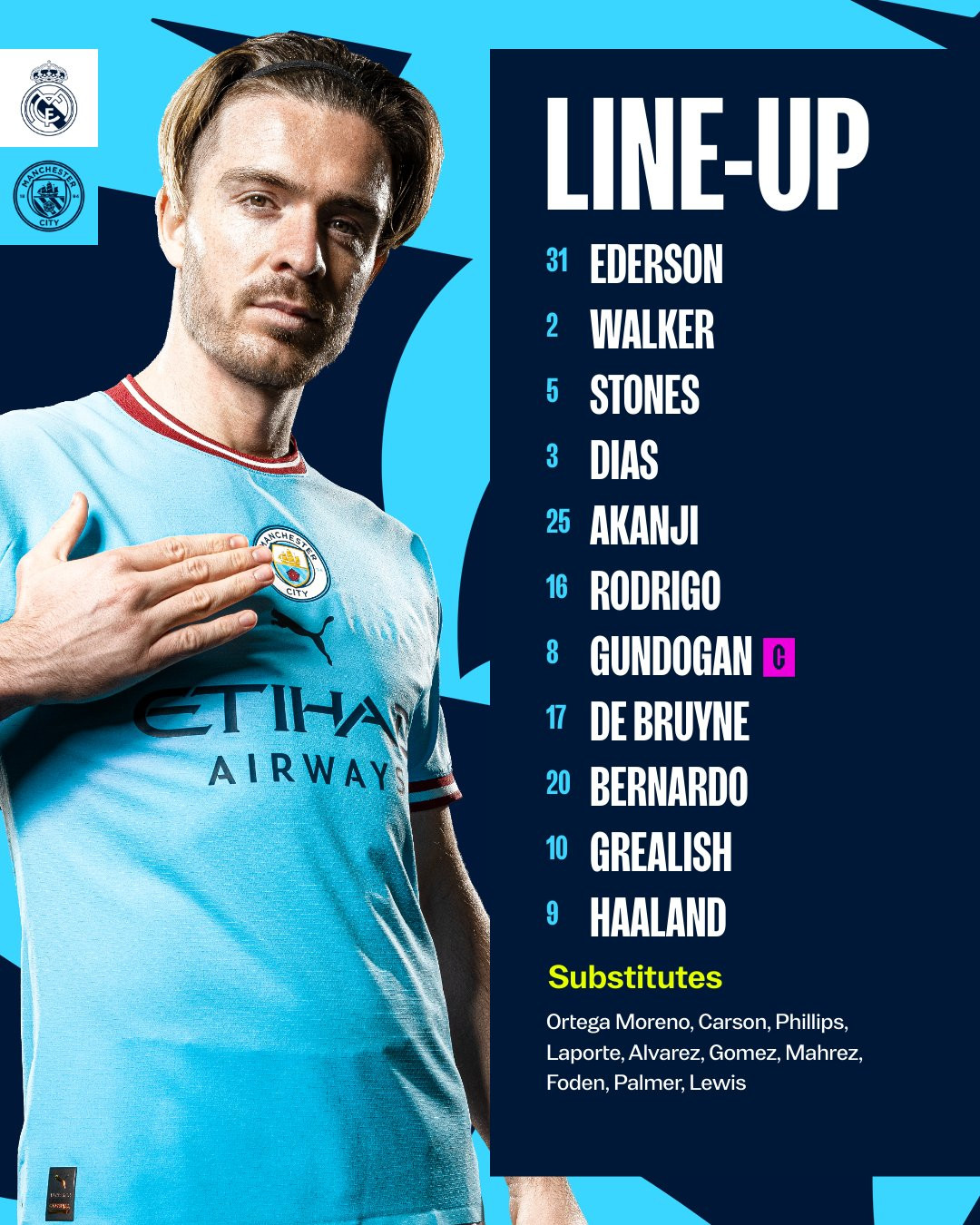Man City: Ederson; Walker, Dias, Akanji; Stones, Rodri; Silva, De Bruyne, Gundogan, Grealish; Haaland.