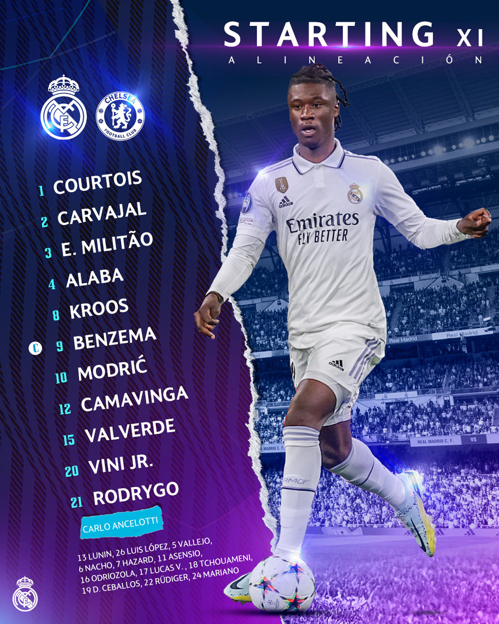 Real Madrid: Courtois; Carvajal, Militao, Alaba; Modric, Camavinga, Kroos; Valverde, Benzema, Vinicius Jr, Rodrygo.
