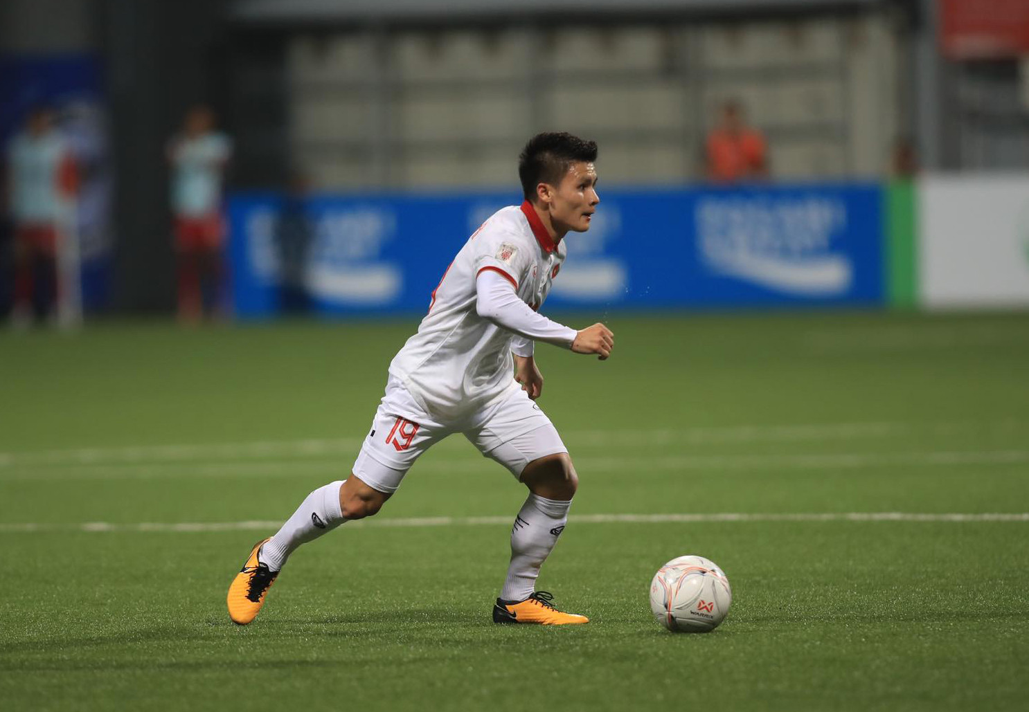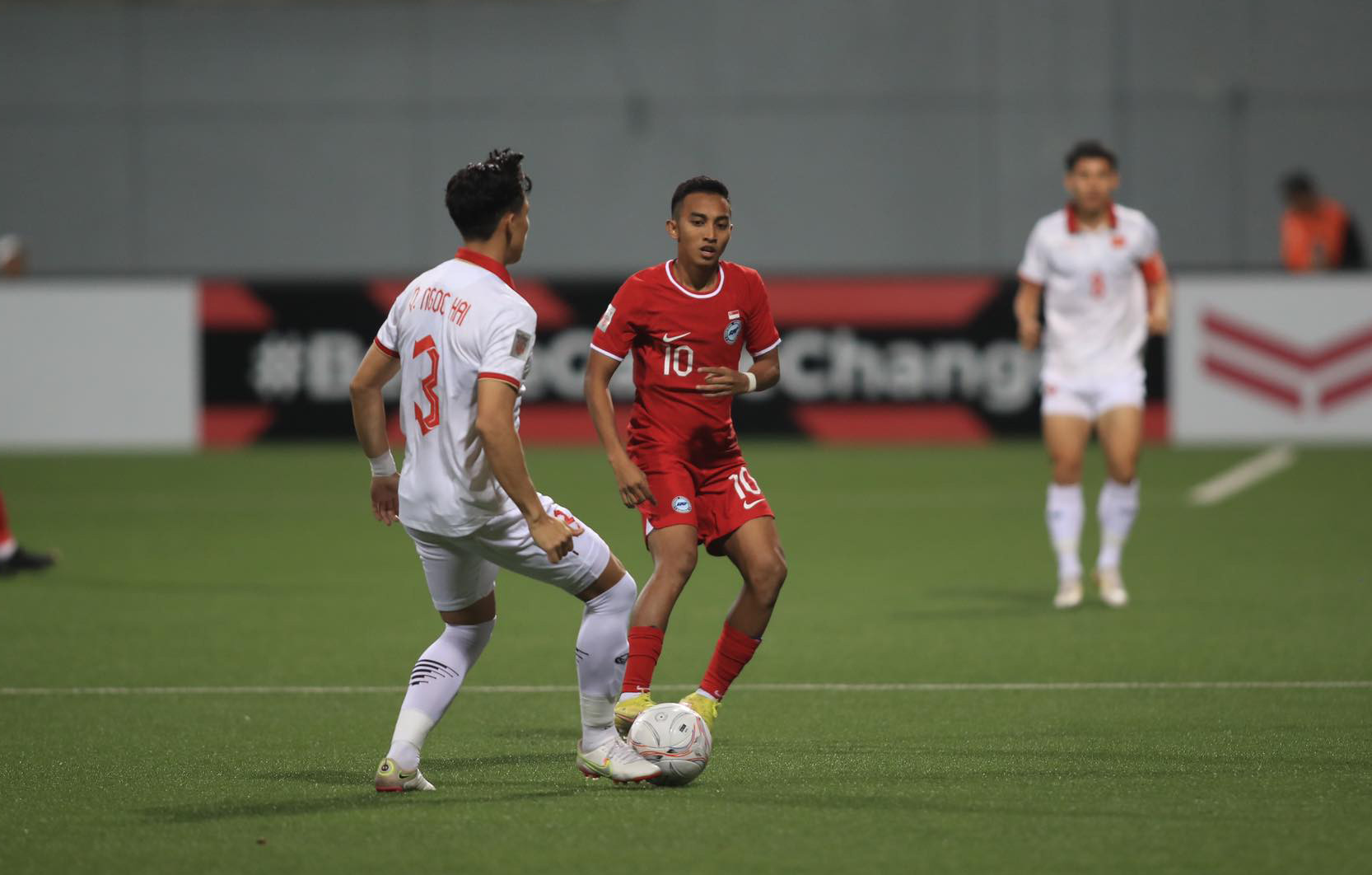 Quế Ngọc Hải phất đường chuyền vượt tuyến cho Văn Thanh thoát xuống bên cánh trái. Hậu vệ phải của tuyển Việt Nam khống chế một nhịp nhưng cầu thủ Singapore lập tức lao về phá bóng. Tuy nhiên, trợ lý trọng tài đã căng cờ báo việt vị.