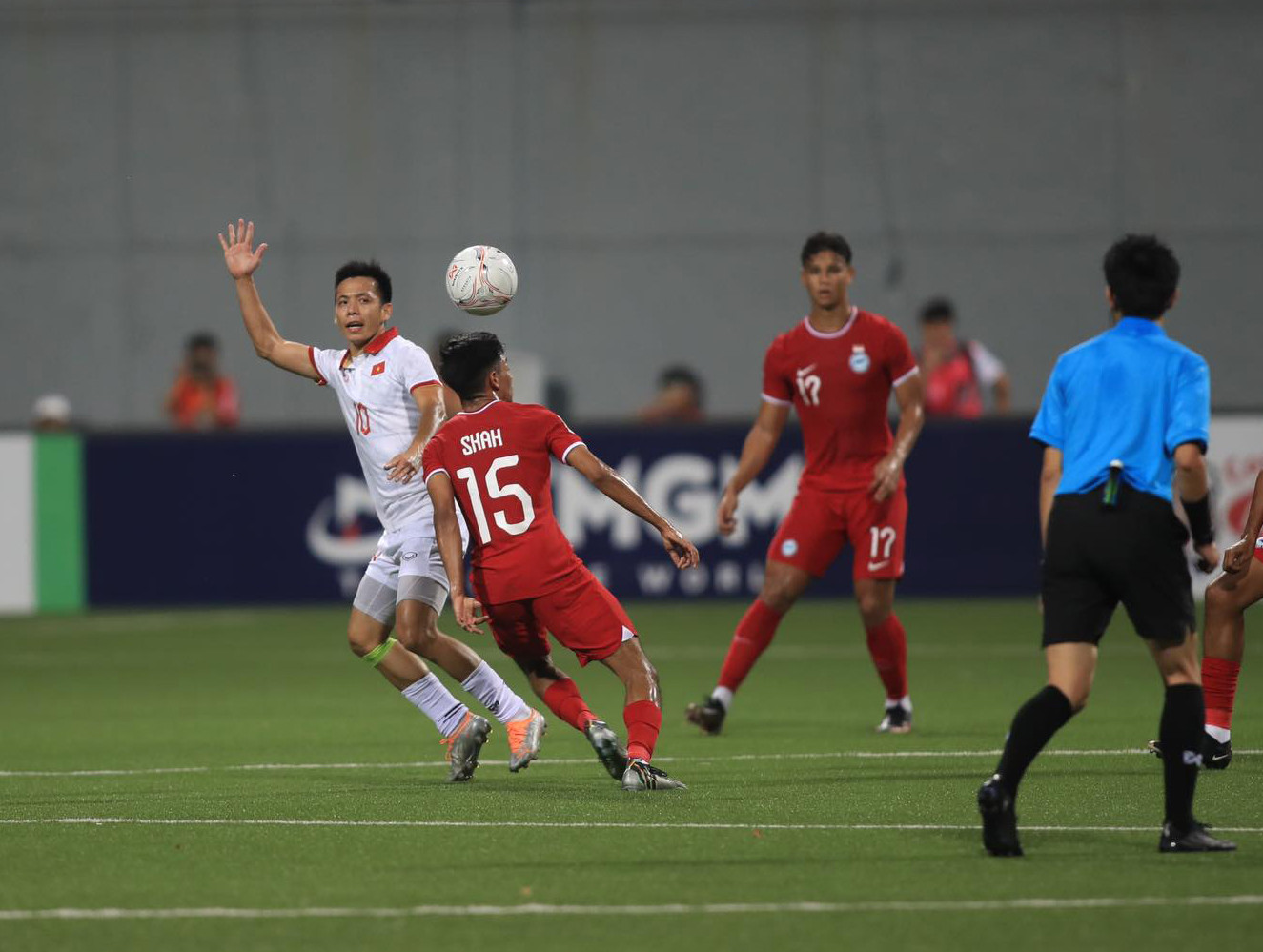 Văn Thanh xâm nhập vòng cấm và bị ngã trong pha tranh chấp với cầu thủ đối phương, trọng tài người Nhật Bản cho rằng không có lỗi của hậu vệ Singapore.