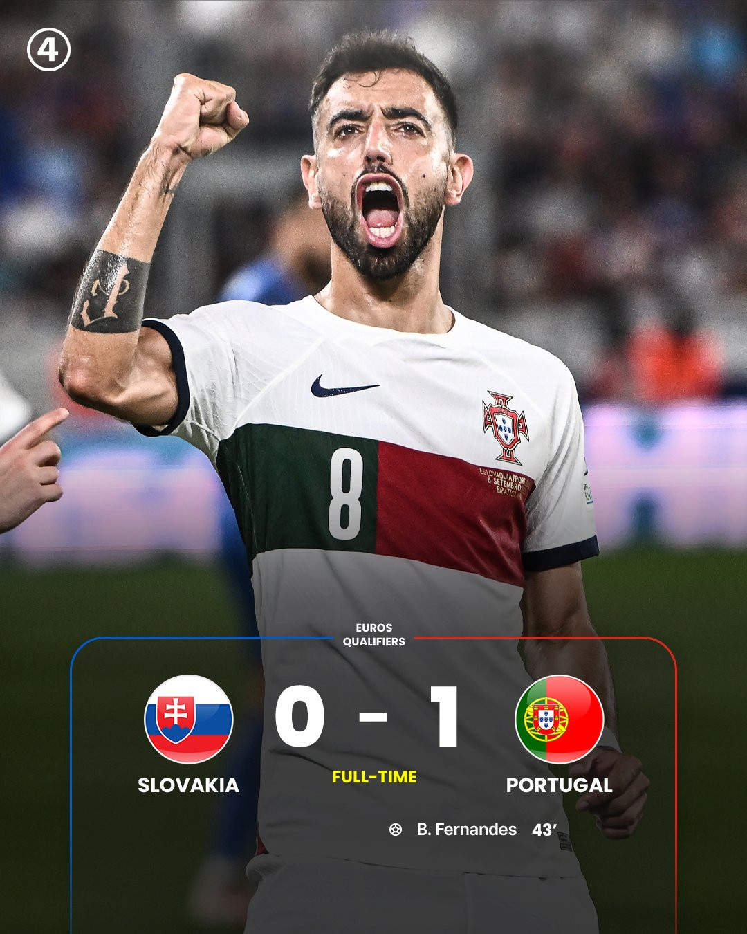 Ronaldo xuất phát trên hàng công Bồ Đào NhaHai đội thi đấu giằng co trong hiệp mộtPhút 43, Bruno Fernandes tung cú sút chìm quyết đoán khai thông bế tắcTiền vệ đội trưởng MU ghi bàn thắng cực kỳ quan trọngSlovakia nỗ lực tìm bàn gỡ ở hiệp haiRonaldo bị kèm sát nên không thể lên tiếngThậm chí anh còn bị phạt thẻ vàng và ngồi ngoài trận sau vì án treo giòChiến thắng nhọc nhằn của Bồ Đào NhaKết quả các trận vòng loại Euro 2024 rạng sáng 9/9