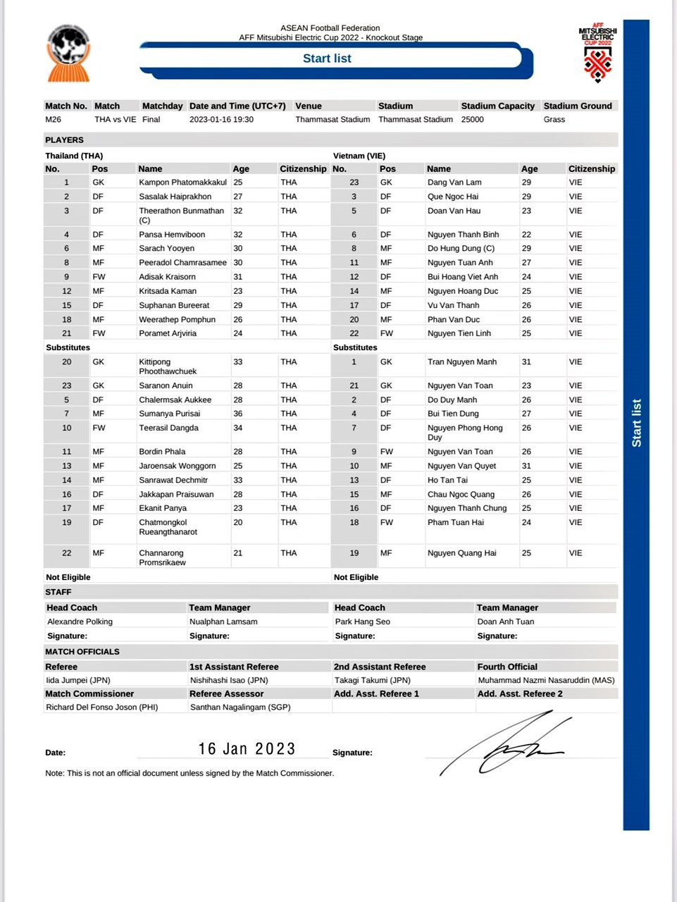 Đội hình xuất phát Thái Lan vs Việt Nam