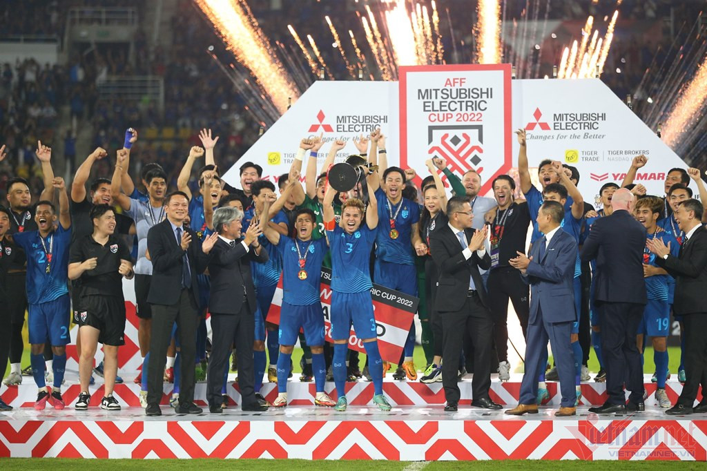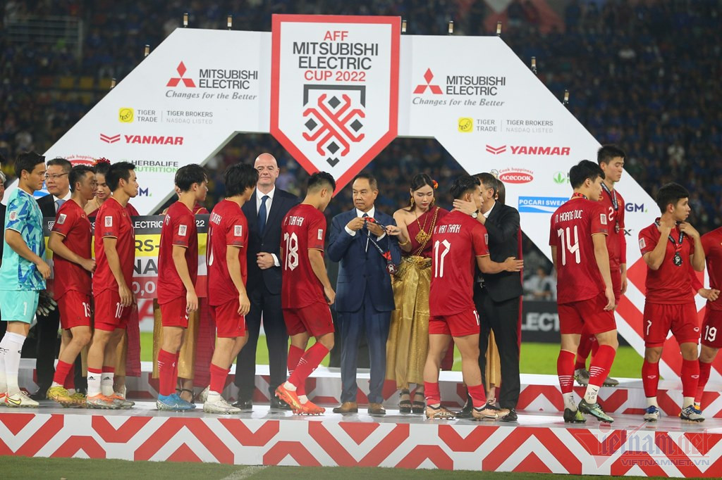 Chủ tịch Liên đoàn bóng đá Thế giới (FIFA) - ông Gianni Infantino và Chủ tịch Hiệp hội bóng đá Thái Lan (FAT) - ông Somyot Poompunmuang và trao chiếc cúp vô địch AFF Cup 2022 cho ĐT Thái Lan.
