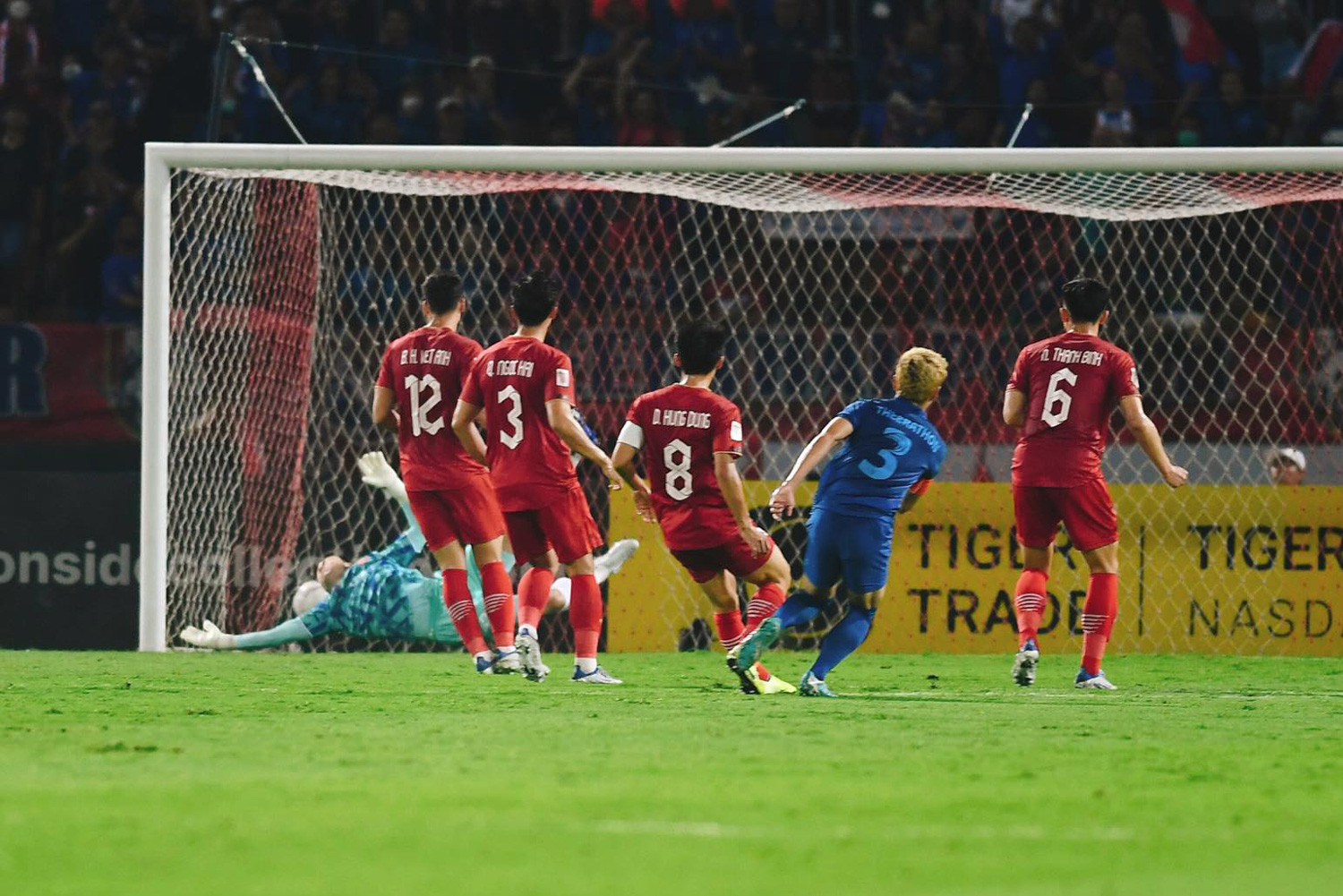 Đón đường chuyền của đồng đội từ cánh trái vào, đội trưởng Theerathon Bunmathan dẫn bóng một nhịp rồi tung cú sút rất căng và hiểm hóc từ ngoài vòng cấm đánh bại thủ thành Đặng Văn Lâm.