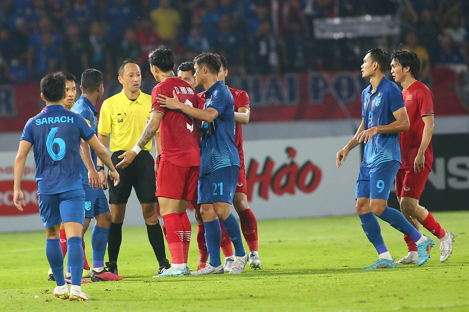 Trận đấu bỗng dưng nóng lên sau tình huống Văn Thanh bị Sasalak Haiprakhon phạm lỗi bên phần sân nhà. Văn Hậu và một số cầu thủ Việt Nam lập tức phản ứng với đội chủ nhà.