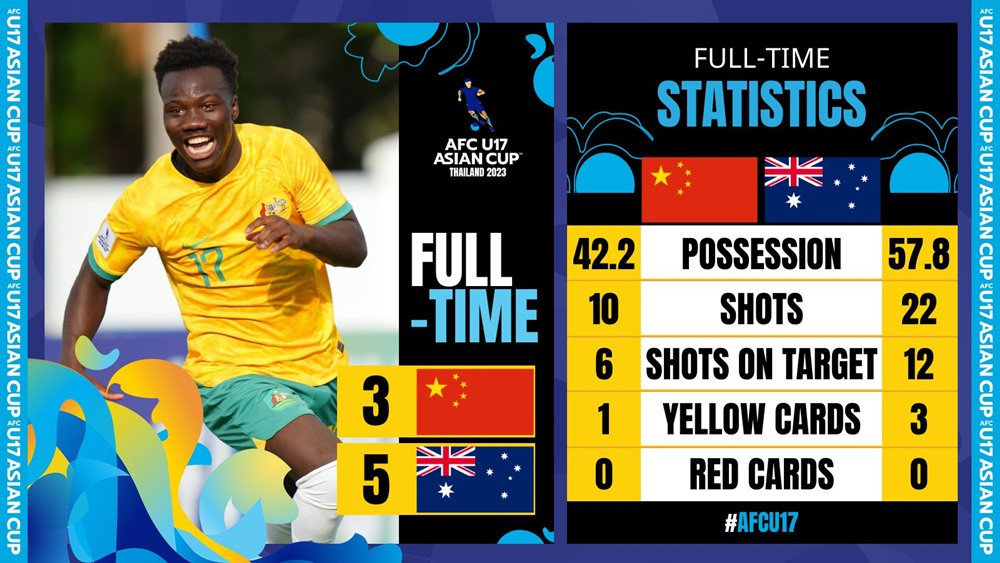 Thất bại 3-5 khiến U17 Trung Quốc (1 điểm) mong manh cơ hội đi tiếp ở VCK U17 châu Á 2023, bởi lượt trận cuối họ đối đầu U17 Saudi Arabia (6 điểm), đội bóng mạnh nhất bảng C. Trong khi đó, U17 Australia với 3 điểm có được cơ hội càng mở rộng hơn.
