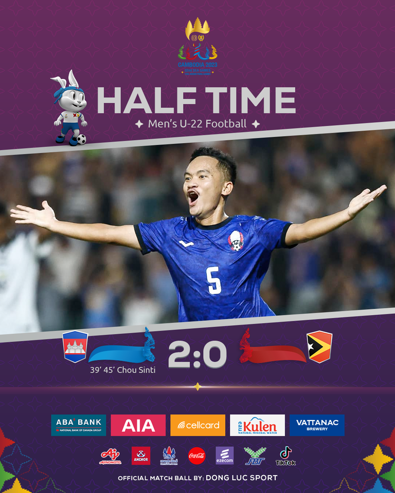 Màn bùng nổ vào cuối hiệp, với cú đúp của tiền vệ Chou Sinti, giúp chủ nhà U22 Campuchia dẫn trước 2-0.