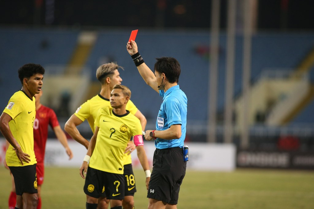 Sau khi tham vấn ý kiến của trợ lý, trọng tài Ryuji Sato quyết định rút thẻ đỏ trực tiếp đối với Azmi vì lỗi đánh nguội đối với Đoàn Văn Hậu.