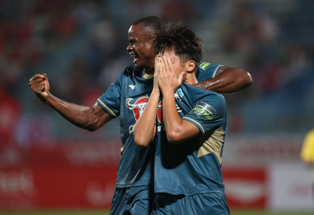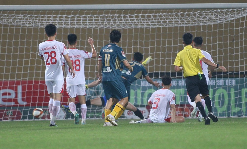 Hoàng Đức có pha độc diễn rồi tung cú sút trong vòng vây của 3 cầu thủ HAGL, tuy nhiên bóng đi tìm đúng vị trí mà thủ môn Văn Lợi đã chọn sẵn.