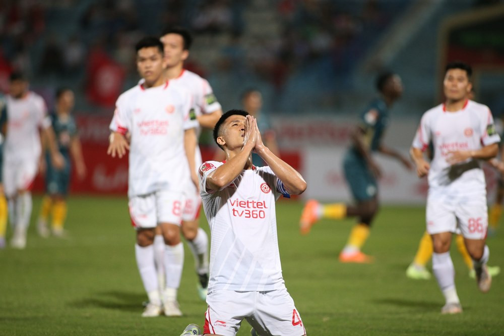 Thêm một cú sút nữa của các cầu thủ Viettel khiến thủ môn Văn Lợi vất vả cản phá.