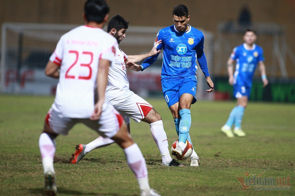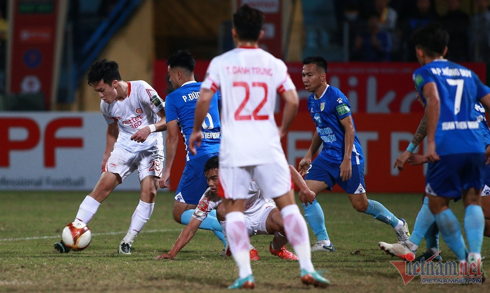 Hoàng Đức xoay sở trong vòng vây của 5 cầu thủ Nam Định trước khi dứt diểm đưa bóng vọt xà ngang đối phương.