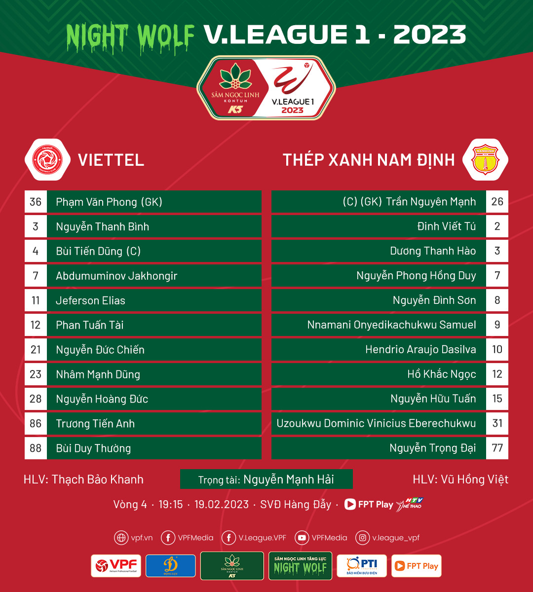 Nam Định: Nguyên Mạnh (26), Viết Tú (2), Hữu Tuấn (15), Thanh Hào (3), Hồng Duy (7), Đình Sơn (8), Khắc Ngọc (12), Trọng Đại (Đức Huy 62'), Hendrio (10), Dominic Vinicius (31), Nnamani (9).