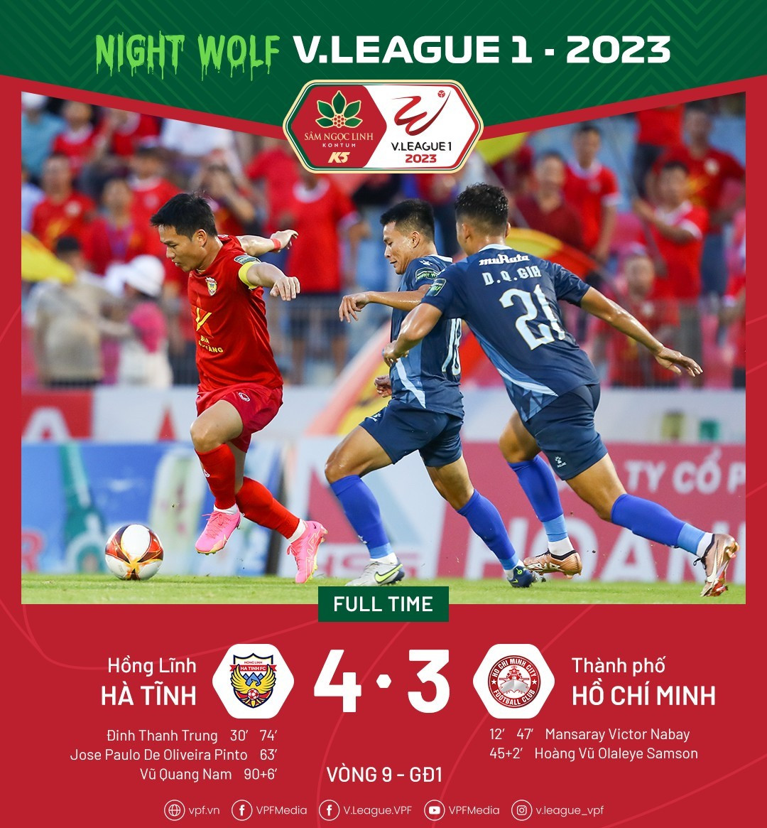 Sân Hà Tĩnh: Văn Long ghi bàn thắng quyết định ở phút bù giờ thứ 7 mang về chiến thắng siêu kịch tính 4-3 cho đội chủ nhà trước TP.HCM.