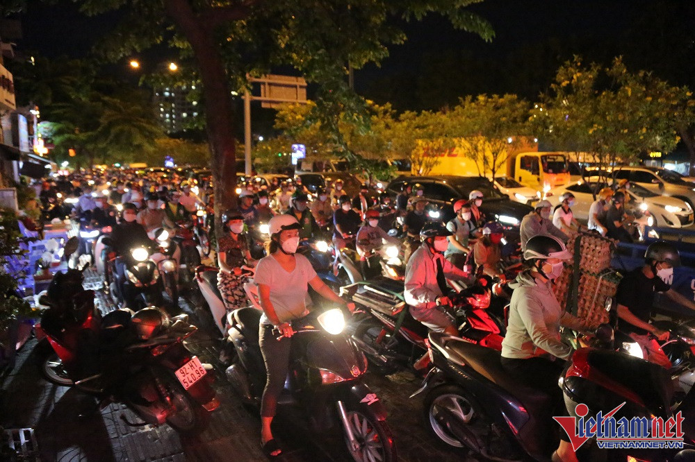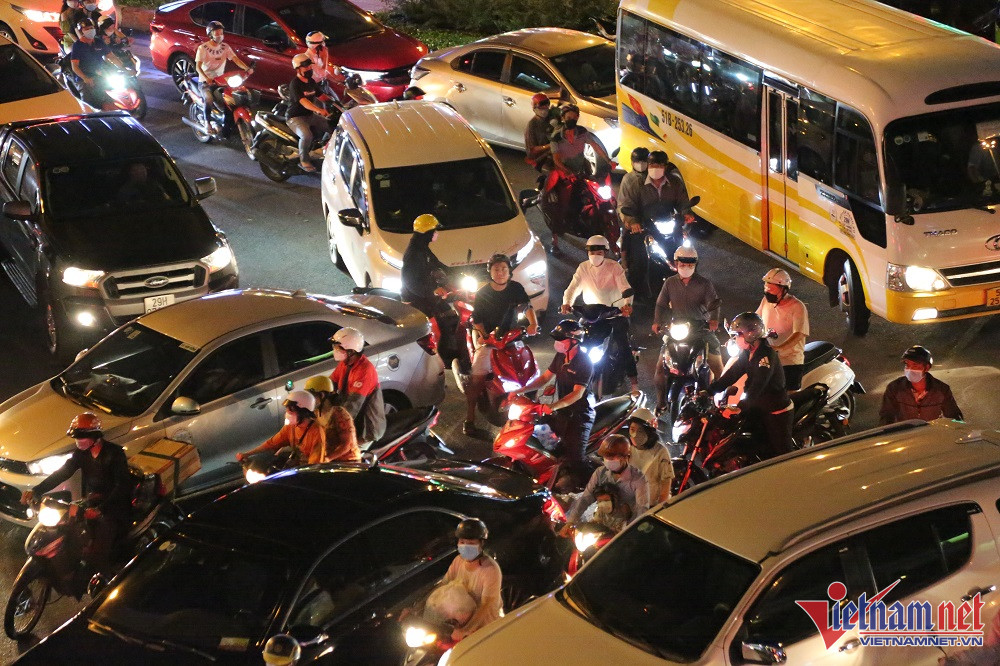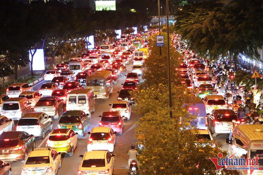 19h tối 23/4, đường Phạm Văn Đồng xảy ra tình trạng ô tô và xe máy chật kín, kéo dài theo hướng lưu thông vào sân bay Tân Sơn Nhất.