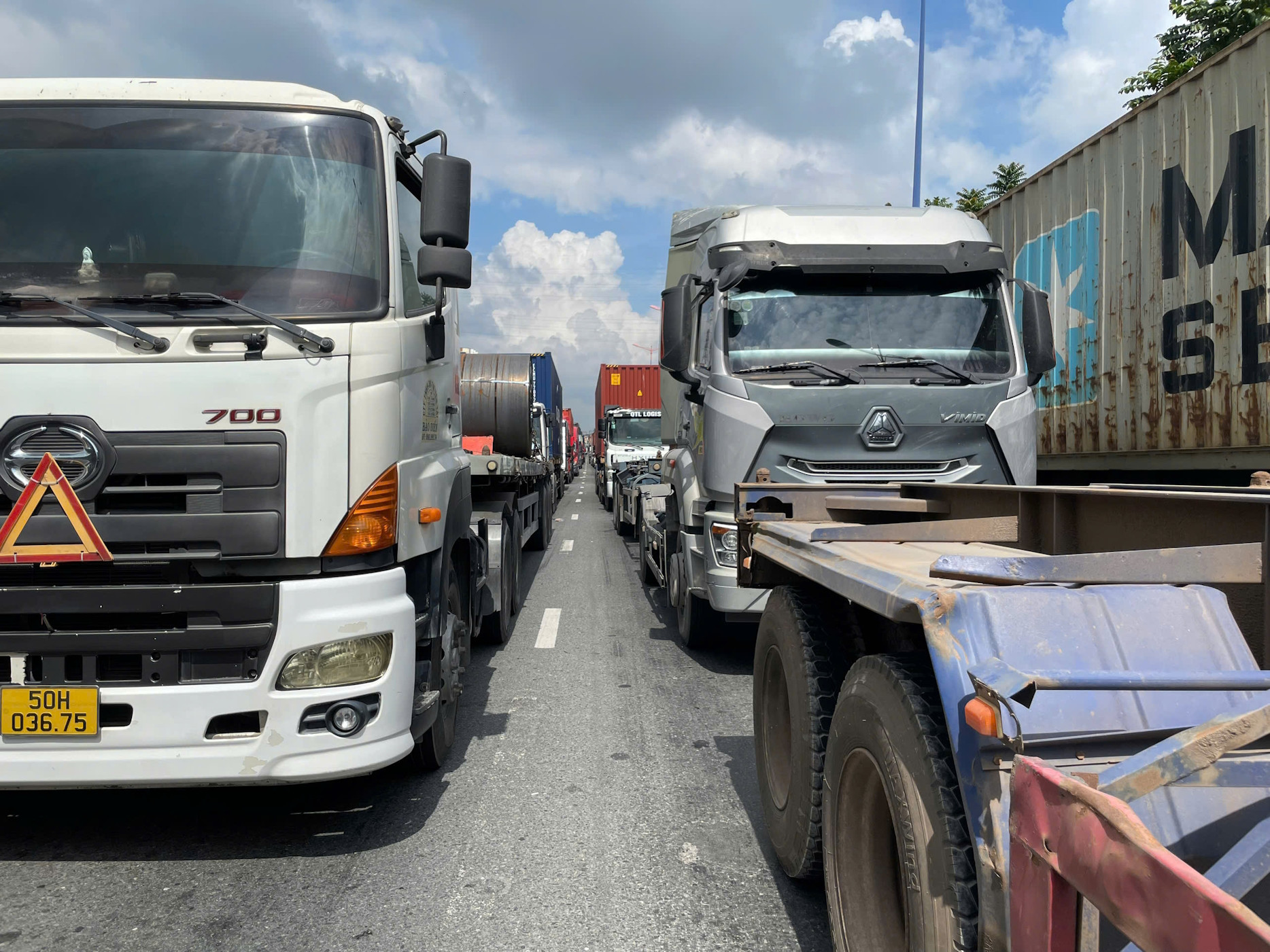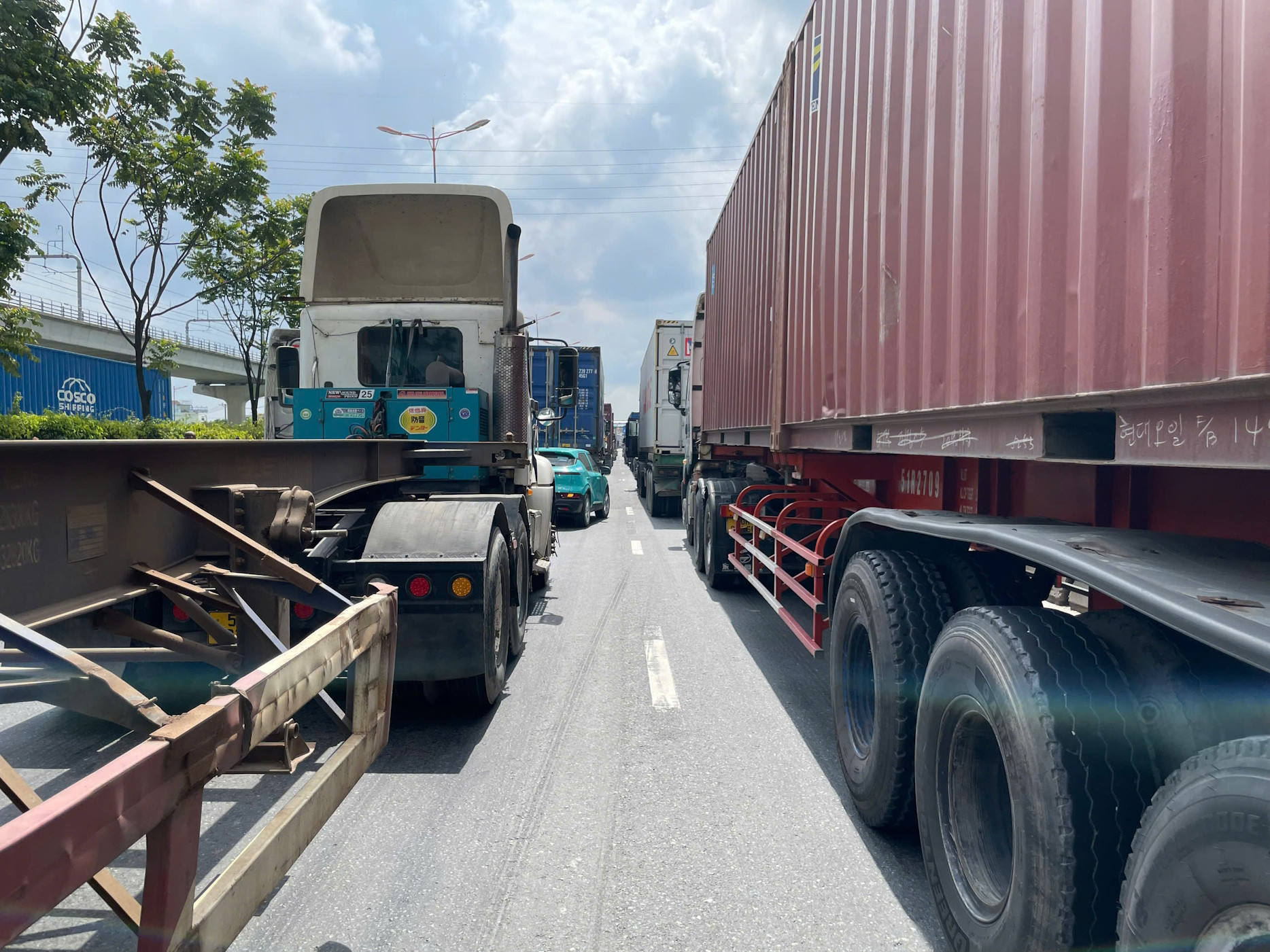 Hàng ngàn phương tiện, chủ yếu là xe tải và xe container, nối đuôi nhau "nhích từng chút". Nhiều tài xế tỏ ra mệt mỏi và bức xúc vì phải "chôn chân" hàng giờ giữa nắng nóng.