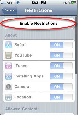 Rắc rối này thường xảy ra đối với những người sử dụng iPhone 4 với cả camera phía trước lẫn phía sau. Apple đã đưa ra một số hướng giải quyết cho vấn đề này. Đầu tiên có thể bạn đã kích hoạt chế độ giới hạn (Restriction). Để giải quyết vấn đề bạn hãy vào Settings, chọn General rồi bấm vào Restrictions. Bạn hãy kiểm tra xem tùy chọn Allow Camera có được thiết lập ở trạng thái ON hay không. Bạn cũng có thể vô hiệu hóa chế độ Restriction bằng cách bấm vào Disable Restrictions.